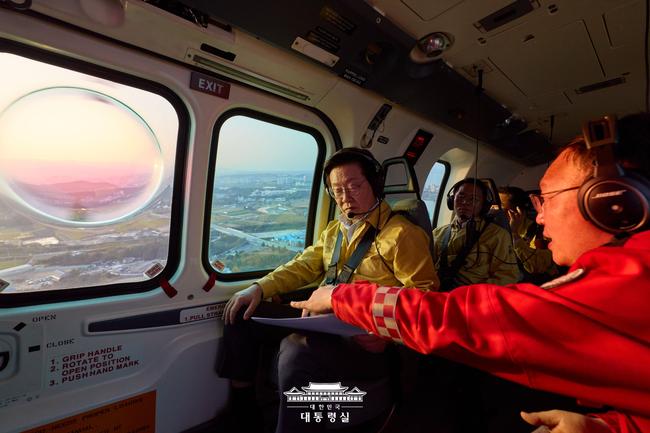 이 대통령은 훈련을 마친 뒤 산림청 산불 진화 헬기에 탑승해 강릉까지 이어지는 동해안 산불 위험지역을 시찰했다. 시찰 과정에서 산림청 산림재난통제관으로부터 과거 산불 피해 지역과 위험 요인에 대한 현장 보고를 받았다.