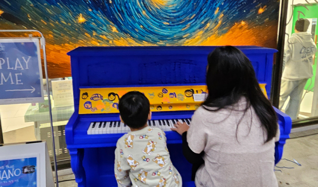 자녀와 함께 방배ART유스센터를 찾은 서초구 주민이 `푸른 별빛 피아노`를 연주하고 있다