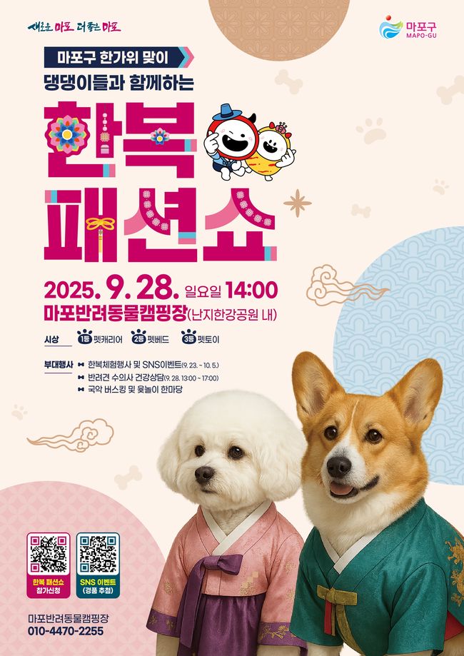서울 마포구(구청장 박강수)는 오는 9월 28일 오후 2시, 마포반려동물캠핑장에서 ‘댕댕이 한복 패션쇼’를 개최한다고 밝혔다. 행사에 참여하는 반려견은 캠핑장에 준비된 한복을 입거나, 가족이 직접 준비한 개성 있는 한복 의상을 착용할 수 있다.
